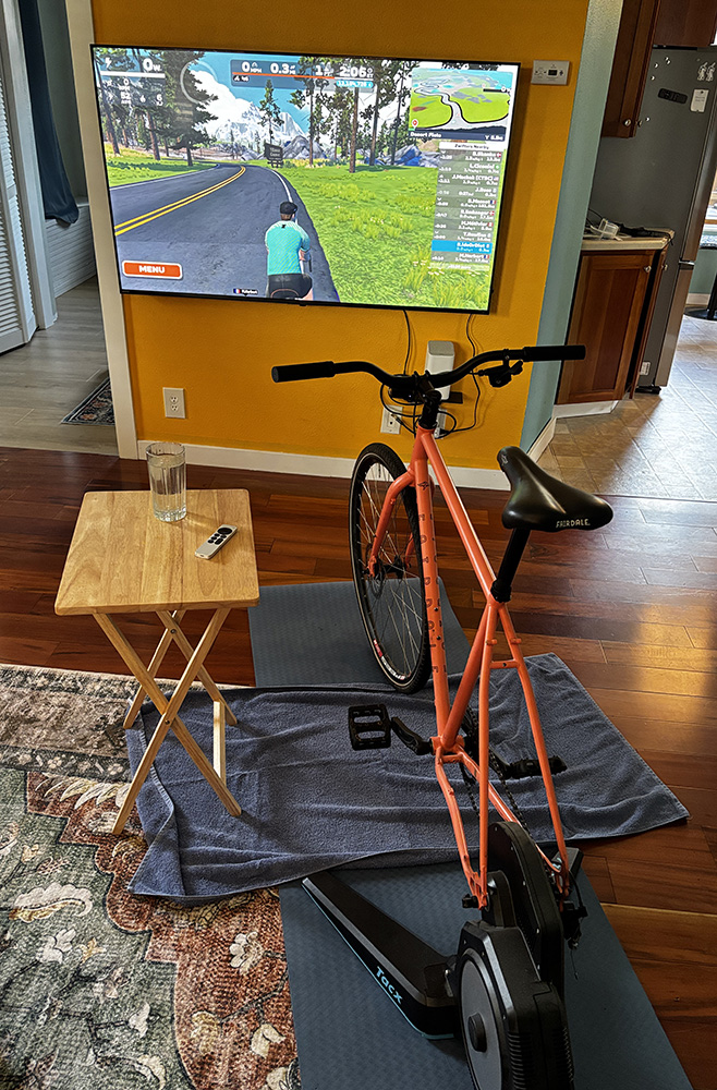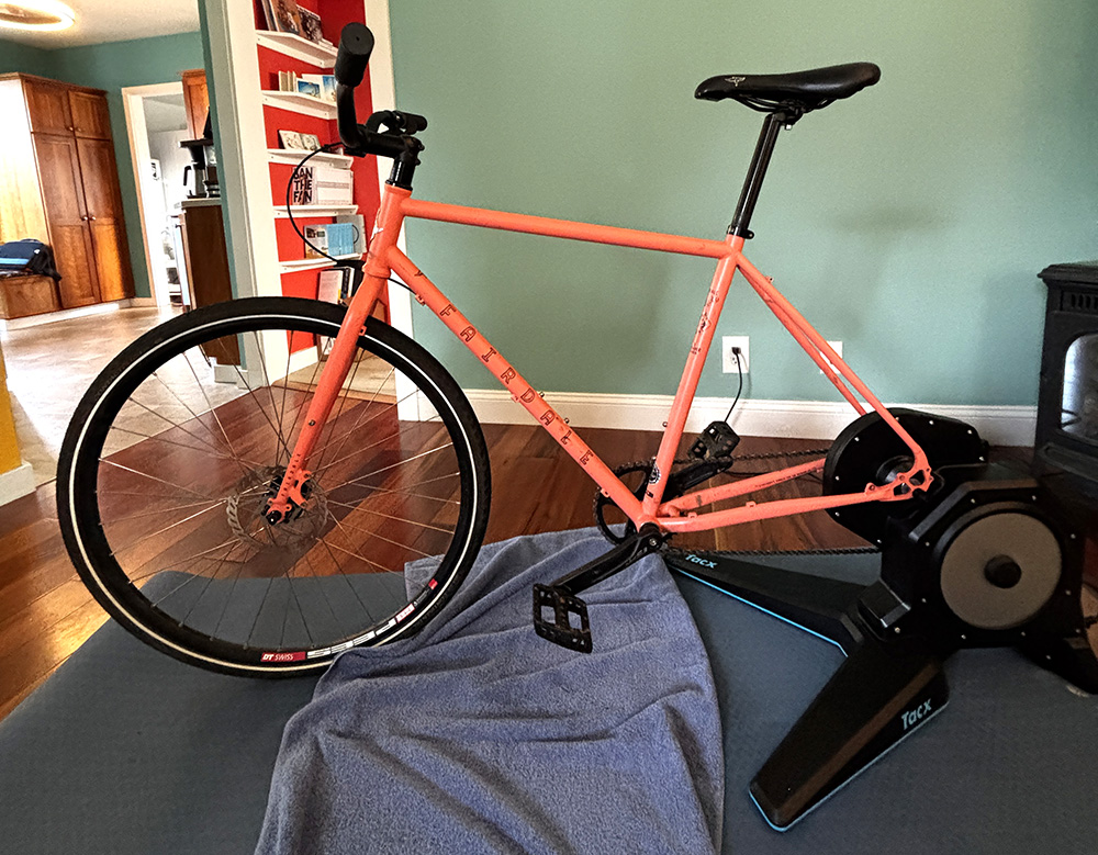 A brand new Fairdale, of course! Though, to be honest, pretty much any bike will work. It can be the bike you ride all the time, or your indoor bike can be a mix of spare parts and on whatever old frame (my dedicated indoor bike doesn’t even have brakes).