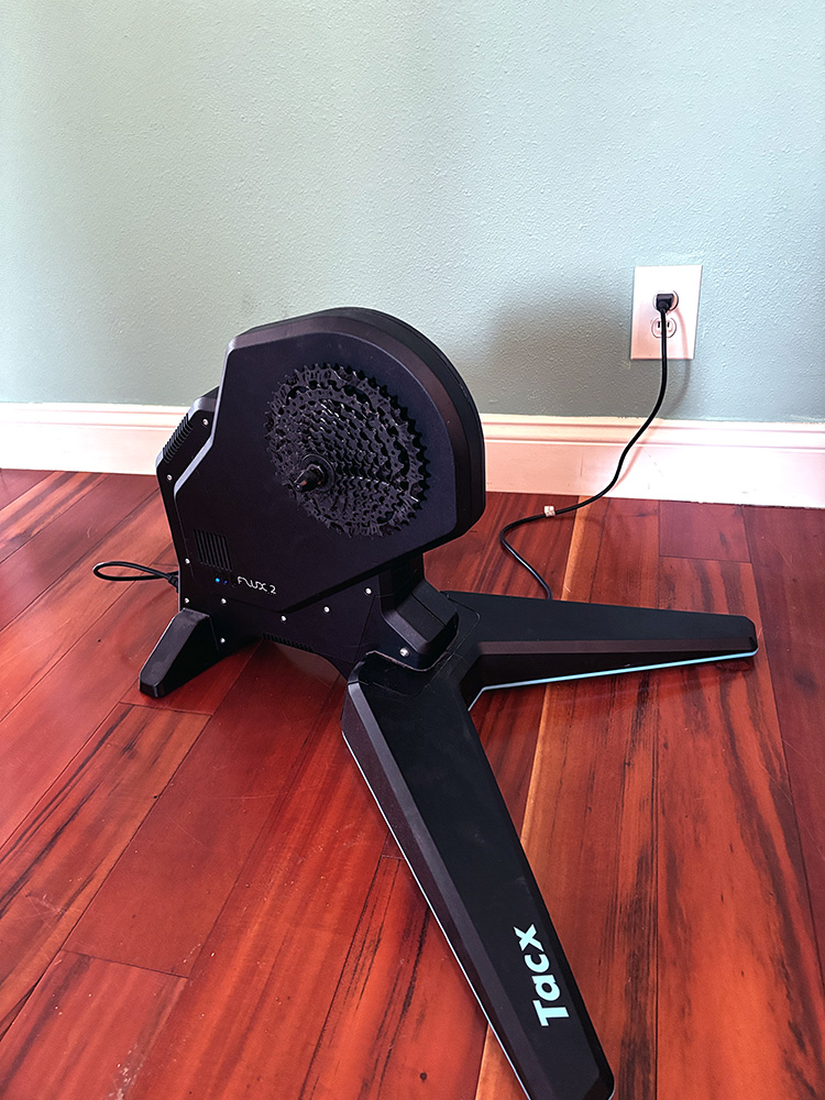 There are all kinds of smart trainers from loads of different brands. They are mostly broken down into two main kinds: “wheel-on” and “wheel-off”. Wheel-on smart trainers are the least expensive. The device locks onto your back wheel, and your rear tire turns the resistance unit. These units are rather loud as the tread of your tires buzzes along on the resistance roller. If you are going to spend any serious time on your indoor bike, I recommend a wheel-off trainer. You’ll remove your bike’s rear wheel and exchange it for the smart trainer. It’s quick and easy to install your bike, and it’s quiet and stable while you ride. I have the TACX Flux 2 trainer, which I picked up for $499.