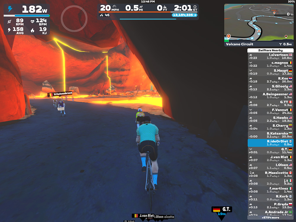 There are virtual races, group rides, and events in the game. On screen, you’ll see the other riders around you, as well as an extensive array of cycling metrics: how much power you are generating with your legs, your speed, the percentage grade of the road you are on, and many more. After a few months of using Zwift, I bought a Garmin heart rate monitor, which also shows up on screen. None of this is essential in any way; they’re just options to keep pedaling without-actually-going-anywhere interesting. It can be motivating to try to maintain a specific power output for a few minutes or beat N.erdyCyclist43 to the top of that hill.