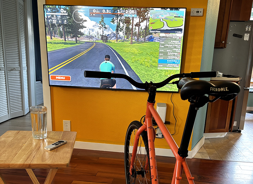 Zwift works on IOS, Android, Mac, and PC. I have mine set up through my Apple TV box and connected to my TV. Once you are signed into Zwift, there are a handful of ways to pedal around inside it. The simplest option is to select a route from the huge library and start pedaling. Free riding around puts the smart trainer into simulation mode. Pedal faster, and you’ll go faster. Your weight, height, and how much power you put through the pedals are used to calculate your virtual speed and the resistance you feel. It ends up feeling like real riding without the worry of having to watch for cars or steer (I agree that steering is one of the fun parts). The other riders you see on screen are real people, presumably with sweat pooling beneath them in their living rooms, too. There’s every kind of route to ride from flat to rolling hills to massive mountains. Some of the routes are full of pretty and fantastical worlds, others are famous cities or well-known Tour de France climbs (Alpe du Zwift is a GPS-accurate replica of Alpe d’Huez that we rode on our Fairdale France trip).